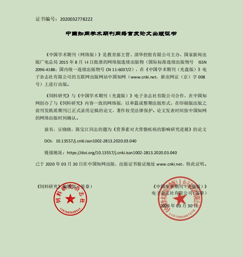 華興寵物食品研發部論文《營養素對犬骨骼疾病的影響研究進展》在北大核心期刊《飼料研究》上發表,并可在中國知網上檢索。